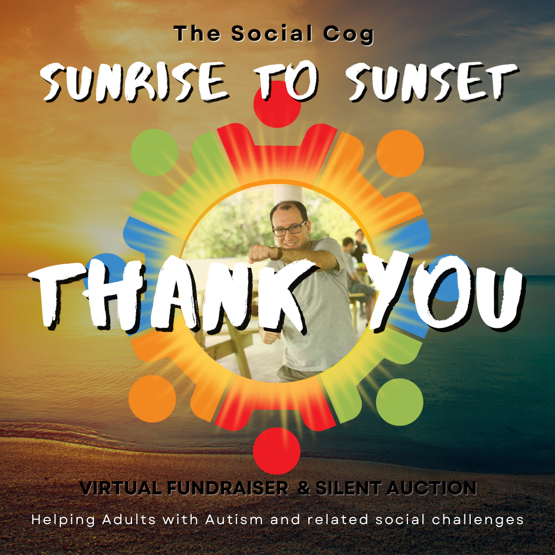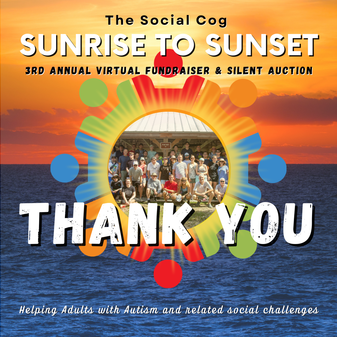 August 6th, 2022Thank you to everyone who donated money, created personal fundraisers, offered their time to help our very small team do this, donated items to our Silent Auction, and all of you that purchased items and participated in our raffle and made Sunrise to Sunset a huge success! We are so very grateful for this amazing community we have. We are touched that you understand how important The Social Cog is to our Members and how you all are always so willing to be SO generous. You all make a difference in our Members' lives! Sunrise to Sunset has raised a total of $25,346!